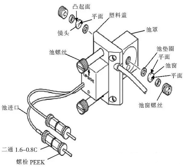解決方法:在停泵或者使用空氣池的情況下觀察氘燈能量是否穩定。若樣品池與參比池能量不穩定,則必須更換氘燈;觀察流通池內是否有氣泡,可以使用異丙醇或甲醇(使用注射器注射,從流通池進口緩緩推入)清洗流通池內部,排除氣泡。流通池的出口處連接的是一根0.3mmI.D.×2m的背壓管(增加背壓,防止氣泡產生),檢查背壓管是否完好或者增加背壓設備;拆除流通池然后清洗池透鏡(流通池構造如圖1所示),如果無法去除污漬,請安裝新的池透鏡(安裝池透鏡片時需注意,鏡片下面一定要先放置池墊圈,否則會導致鏡片被壓碎);觀察室內環境是否符合液相色譜的實驗室環境要求,改變儀器的位置,或防止所在環境有過多的變化; 雙波長模式中的噪音振幅是單波長模式中的10倍以上。小量的波長更改會使流動相吸光度發生非常大的更改。吸光度變化越大,噪音也就越大。更改波長,使其每單位波長的變化對吸光度產生的變化最小。通過這三步檢查,故障即可排除。