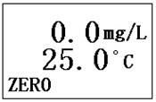 將溶解氧電極放入5%的新鮮配制的亞硫酸鈉溶液中,在儀器處于溶解氧測量工作狀態下,按“模式”鍵,儀器即進入“零氧校準”工作狀態,待讀數穩定后,按“確定”鍵,貯存電極當前的零氧值,零氧校準結束。此時,儀器還處于“零氧校準”工作狀態。再按“模式”鍵,儀器進入“滿度校準”工作狀態。零氧校準顯示界面如下: