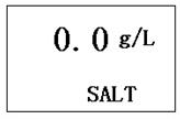在儀器處于“滿度校準”工作狀態下,按“模式”鍵,儀器即進入鹽度設置”工作狀態。此時儀器顯示當前設置的鹽度值,可以按“▲”鍵或“▼”鍵修改鹽度值,修改為實際鹽度值后,按“確定”鍵,貯存儀器修改后鹽度值,則完成鹽度設置。此時,儀器還處于“鹽度校準”工作狀態。再按“模式”鍵,儀器進入“溶解氧濃度測量”工作狀態。鹽度設置顯示界面如下: