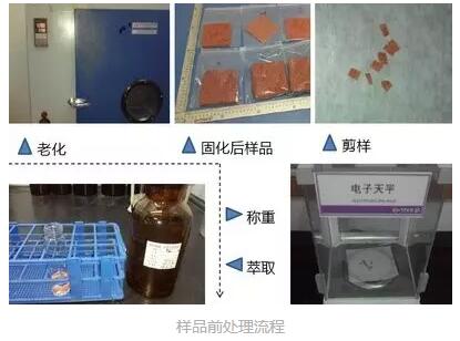 按照推薦性國家標準《合成材料跑道面層》對送檢試樣的要求,樣品應在固化14天后進行測試.因事情緊急,為更客觀地檢測操場情況,將樣品放入烤箱加速其固化,剪樣、稱重、萃取。