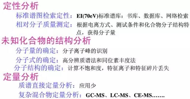 質譜最重要的應用是分離同位素并測定它們的原子質量及相對豐度。測定原子質量的精度超過化學測量方法,大約2/3以上的原子的精確質量是用質譜方法測定的。質譜方法還可用于有機化學分析,特別是微量雜質分析,測量分子的分子量,為確定化合物的分子式和分子結構提供可靠的依據。由于化合物有著像指紋一樣的獨特質譜,質譜儀在工業生產中也得到廣泛應用。