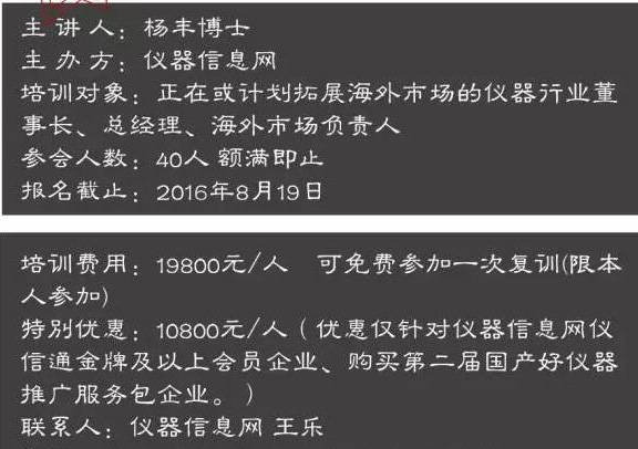 為了幫助優秀的科學儀器產品和企業走出國門,開拓國際市場,儀器信息網特邀具有豐富海外市場開拓經驗的楊豐博士進行《中國科學儀器企業如何拓展海外市場》主題培訓,系統的從戰略及戰術層面為參會企業答疑解惑。