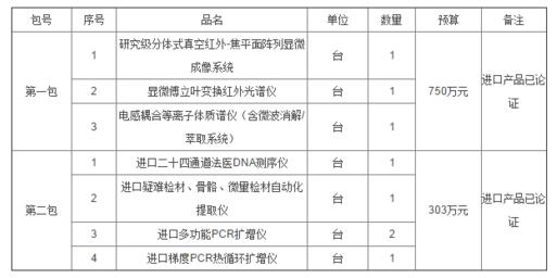 7月25日,甘肅省公安廳全省刑事技術鑒定中心發布了實驗室設備招標公告,采購儀器包括顯微成像系統、紅外光譜儀、離子體質譜儀、PCR擴增儀等檢測儀器,總預算達到了1053萬(人民幣)。