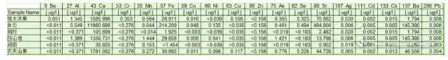 從上表中可以看出,上述所有水的金屬指標均是合格的,其中依云水(某品牌礦泉水)的Ca和Sr含量最高,分別為11980μg/L、484μg/L,據(jù)生活常識可知當水中鈣、鎂離子含量較高是水會有一種苦澀感,但是實際上依云水比較甘甜,故可推測是元素Sr(鍶)的作用。
