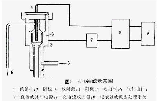 ECD工作原理是:由柱流出的載氣及吹掃氣進入ECD池,在放射源放出β-射線的轟擊下被電離,產生大量電子。在電源、陰極和陽極電場作用下,該電子流向陽極,得到10-9-10-8A的基流。當電負性組分從柱后進入檢測器時,即俘獲池內電子,使基流下降,產生一負峰。通過放大器放大,在記錄器記錄,即為響應信號。其大小與進入池中組分量成正比。負峰不便觀察和處理,通過極性轉換即為正峰。