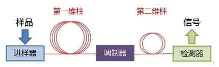 全二維氣相色譜(comprehensive two-dimensional GC, GC×GC)是在傳統的一維氣相色譜上發展起來的一種新的色譜分析技術。其主要原理是把分離機理不同而又互相獨立的兩支色譜柱以串聯方式連接,中間裝有一個調制器(modulator), 經第一根柱子分離后的所有餾出物在調制器內進行濃縮聚集后以周期性的脈沖形式釋放到第二根柱子里進行繼續分離,最后進入色譜檢測器。這樣在第一維沒有完全分開的組分(共餾出物)在第二維進行進一步分離,達到了正交分離的效果。