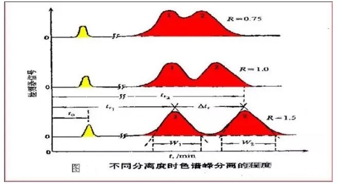 因?yàn)樯V流出曲線符合高斯分布,所以分離度R與色譜柱長(zhǎng)度L之間不是正比關(guān)系而是與長(zhǎng)度的平方根成正比,,分離度R=1.5,兩個(gè)色譜峰就達(dá)到了基線分離。