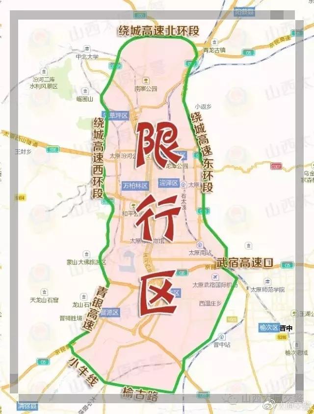 二、限行區域:繞城高速東環段、太榆路(武宿高速口至晉中段)以西,繞城高速北環段以南,繞城高速西環段、青銀高速(太原羅城至清徐段)以東,小牛線、榆古路以北(不含上述道路)道路范圍內。