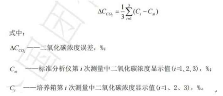 其中,二氧化碳濃度誤差檢測步驟為:設定培養箱中二氧化碳濃度,然后將二氧化碳分析儀開機預熱5min,用氣管連接分析儀的進氣口,另一端接入培養箱中,運行培養箱,待二氧化碳濃度值達到設定值,顯示穩定后,對分析儀和培養箱分別進行數據采集,每間隔2min記錄1次,共記錄3組數據,取3次測量的儀器示值與標準值之差的算術平均值作為示值誤差。