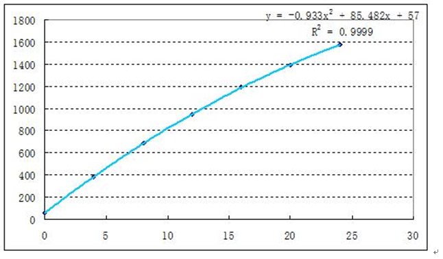 分別吸取C(k)=100μg/mL的鉀標(biāo)準(zhǔn)溶液(0、2.00、4.00、6.00、8.00、10.00、12.00)mL于50mL容量瓶中,用乙酸銨溶液定容,即為溶度(0、4、8、12、16、20、24)μg/mL的鉀標(biāo)準(zhǔn)系列溶液。以空白溶液調(diào)節(jié)儀器零點(diǎn),用火焰光度計(jì)上測(cè)定,繪制標(biāo)準(zhǔn)曲線并求出回歸方程。